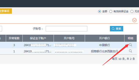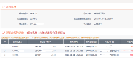 2)同一个子账号中有多笔入账时,外层“合并”显示了。保证金入账查看页面是以子账号(即,投标单位)为索引,若该子账号下有多笔入账(含其他单位打入的异常入账,点击明细可以查看到具体),则子账号数量少于入账笔数。