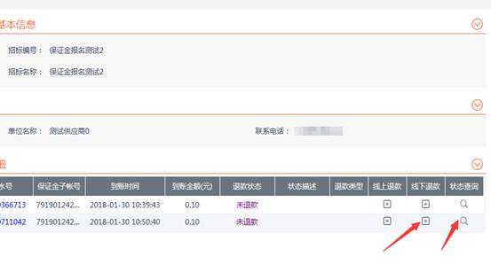 答:在保证金退款情况中可以查看保证金的退款情况。对于系统中显示已退款,但投标单位反馈未收到的个别异常情况,可在该笔明细中点击“状态查询”,获取银行最终的出账结果。