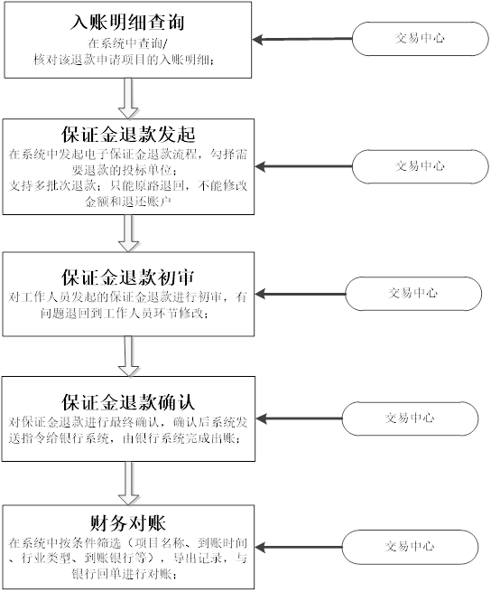 交易结束后,交易发起方以面形式发出保证金退还通知,列明应退还保证金的响应方单位名称和退还金额,由交易中心在系统中操作保证金退款。交易中心在系统中操作保证金退款的基本流程如下:
