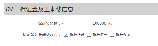 第二步:在招标文件备案环节中设置项目的保证金金额。保证金缴纳方式,可多项选择。如采取网上保证金系统模式,则需要选择银行转账方式,对于其他递交方式,系统中无法自动识别是否有效,需招标人或招标代理自行判别。