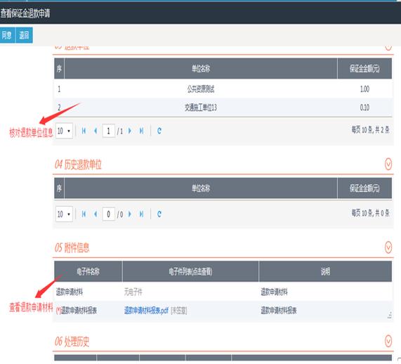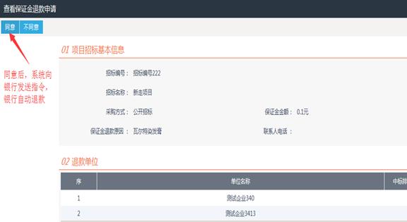 第四步:中心复核人员对保证金退款进行最终确认,点击同意后,系统自动发送指令给银行,银行系统进行退款;