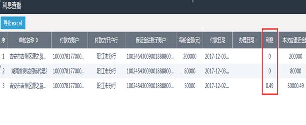 中心工作人员在保证金利息查看模块查看每笔保证金退息情况。利息是银行系统在完成退款后返回的结果,在交易系统中展示。中心财务若有需要可以让银行给出具体明细。