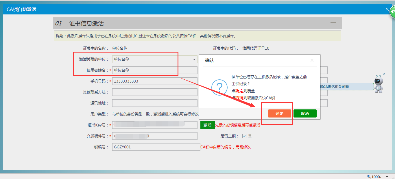 2)按照正常CA锁激活顺序,激活新办CA主锁,系统会提示“该单位已经存在CA主锁激活记录,是否激活?”