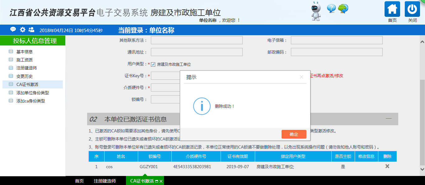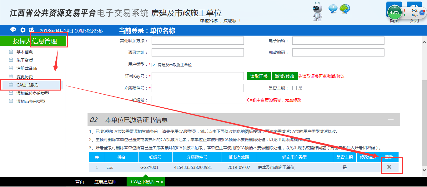 1)使用账号登录系统后,点击“信息管理”菜单下的“CA证书激活”模块(每个单位类型下都有该模块),找到原先主锁激活记录,点击“×”按钮(此方法适合能使用账号登录系统的用户,若不记得账号可使用第一种方法);