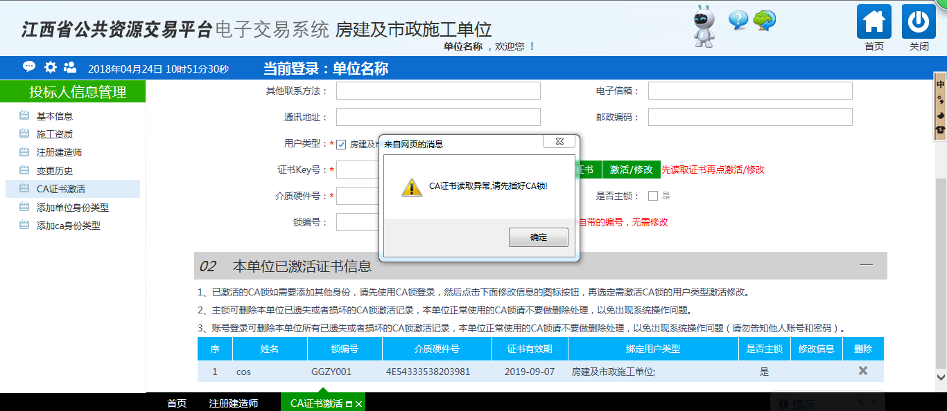 注意:这时候需要插上新办的CA主锁,否则系统会提示“CA读取异常,请插好CA锁”