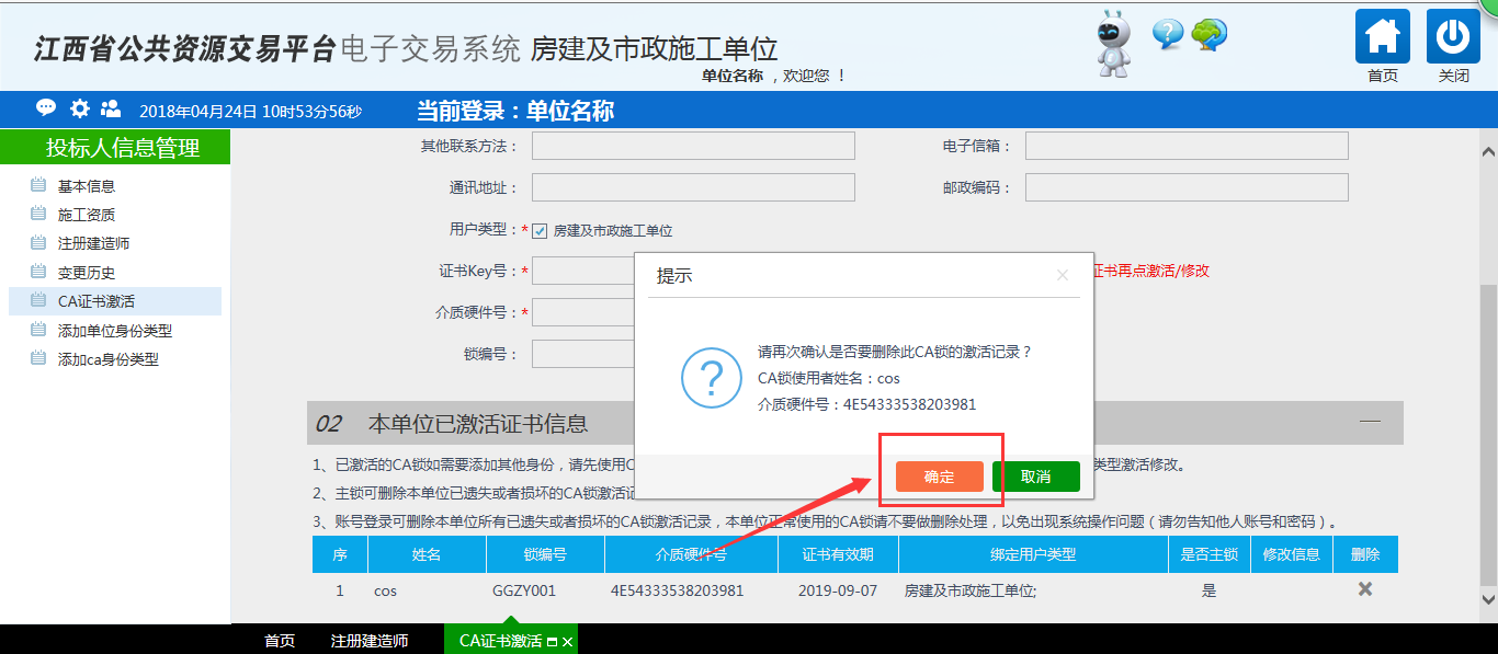 2)插好新办CA锁,点击确定后,重新点击“×”按钮,系统会提示确认要删除的CA主锁信息,确认后点击“确定”按钮,即可将原先主锁激活记录删除;这时候就可以按照正常的CA锁激活顺序激活新办CA主锁了。